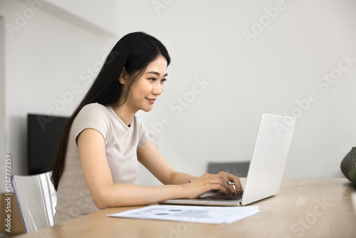 Young Asian woman sitting at desk, working intently on laptop, engage with her on-line tasks at home, studying using education platform, looks focused while read document, analyze data, do research