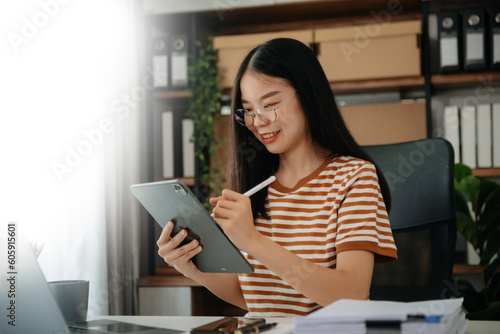 Young attractive Asian woman smiling thinking planning writing in notebook, tablet and laptop working from home, at office