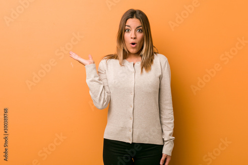 Young authentic charismatic real people woman against a wall impressed holding copy space on palm.