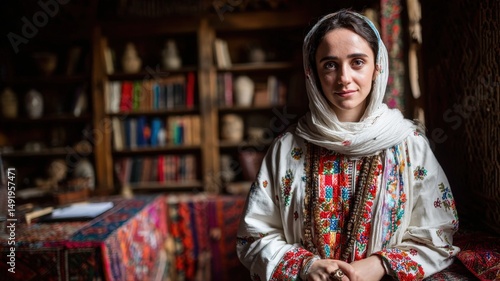Young Azerbaijani Woman in Embroidered Tunic and Soft Headscarf Posing in a Traditional Interior