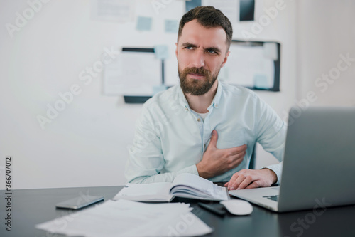 young bearded man looking miserable suffering extreme heartache at work while studying business project in his modern office, holds hand near chest, sick at work