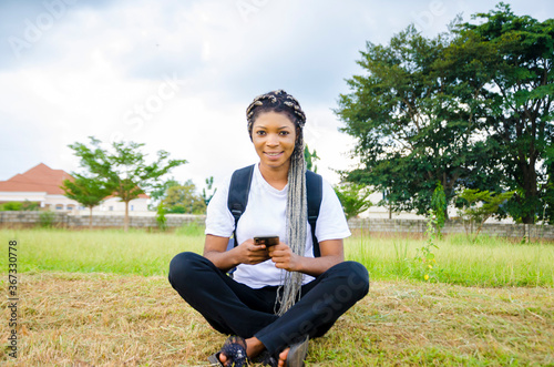 young beautiful african lady feeling excited as she seats in an open field operating her cellphone