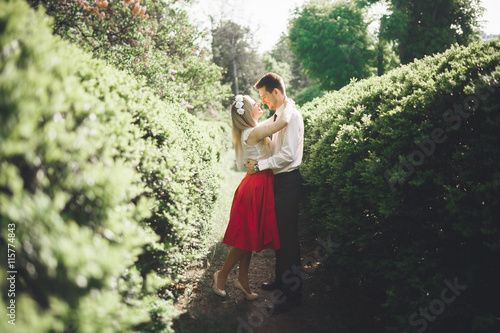 Young beautiful couple kissing and hugging near trees with blossom in summer park