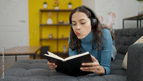 Young beautiful hispanic woman reading book lying on sofa wearing headphones at home