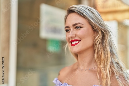 Young beautiful hispanic woman smiling confident looking to the side at street