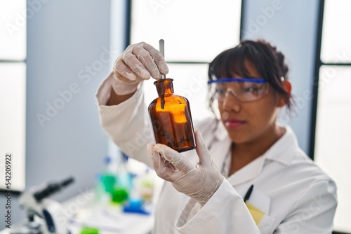 Young beautiful latin woman scientist holding plant with tweezers on bottle at laboratory