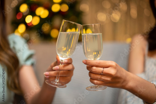 Young beautiful people sitting on the couch and clinking glass of champagne to toasting with happiness