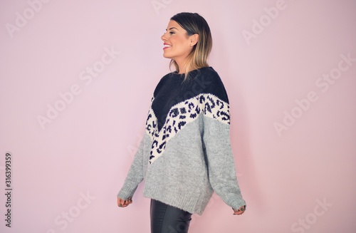 Young beautiful woman wearing fashionable clothes smiling happy and confident. Standing with smile on face over isolated pink background