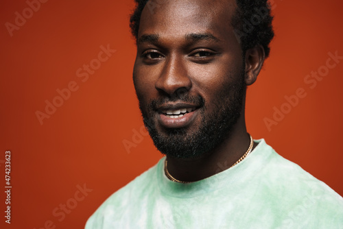 Young black man with beard smiling and looking at camera