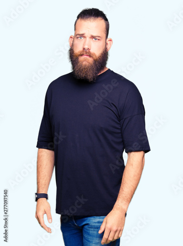 Young blond man wearing casual t-shirt depressed and worry for distress, crying angry and afraid. Sad expression.