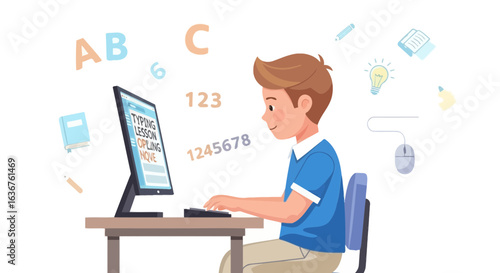 Young Boy Learning Typing Skills on a Computer Cartoon Illustration