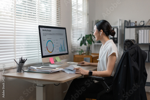 Young business finance market analyst in eyeglasses working at office .Business woman analyze document Graphs and diagramm on Desktop Computer screen.