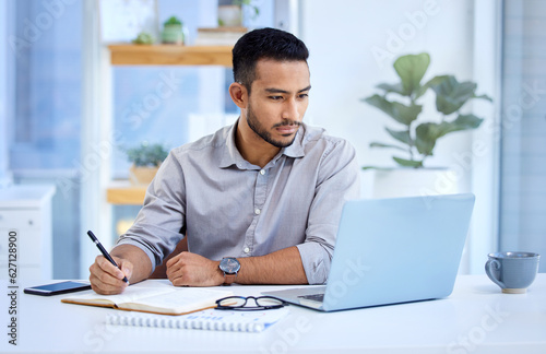 Young business man, writing and notebook with laptop, ideas or schedule planning at web design job. Businessman, book and computer with notes, brainstorming or problem solving for report in workplace
