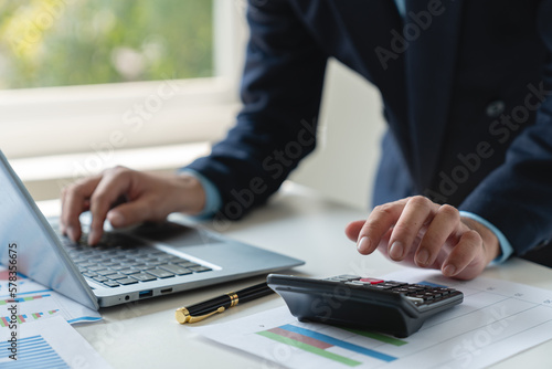 Young businessman analyzing Calculate with investment calculator, income, tax, account from data graph. Financial income in real estate projects View earnings on laptop at office desk.