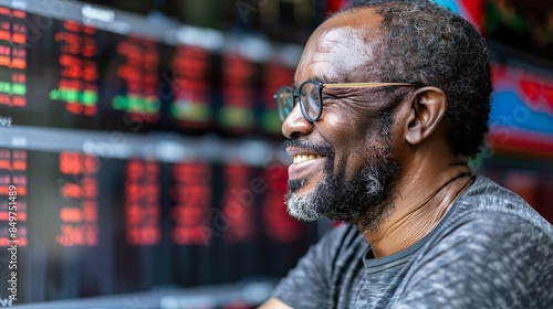 Young Businessman Analyzing Colorful Financial Data on Digital Screen