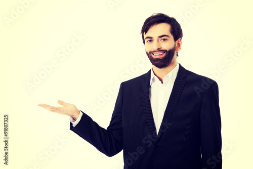 Young businessman showing empty copyspace on hand.
