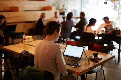 Young businessman working with computer and phone in a cafeteria