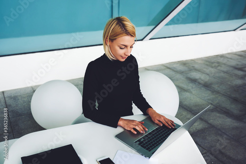 Young businesswoman keyboarding on net-book while sitting in modern office interior, confident female entrepreneur searching information in internet via laptop computer before meeting with client