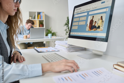 Young businesswoman sitting at her workplace and reading resume on computer while working in office