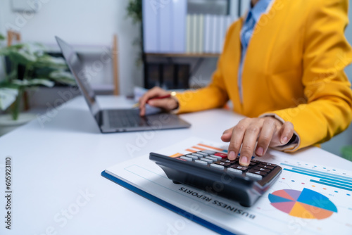Young busy asian business woman manager, lawyer doing bookkeeping audit graph documents checking Bank Reconciliation, Base Stock, Last Invoice Price, Freight, Drop Product or Drop Section Decisions
