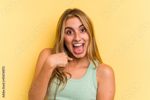 Young caucasian blonde woman isolated on yellow background surprised pointing with finger, smiling broadly.