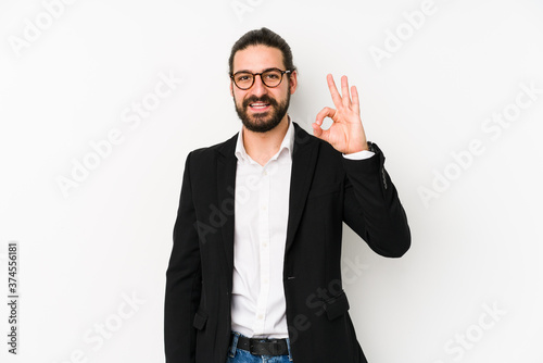 Young caucasian business man isolated on a white background cheerful and confident showing ok gesture.