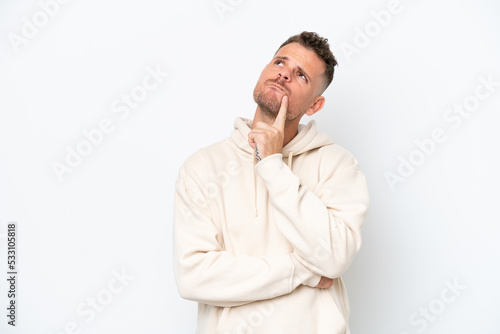 Young caucasian handsome man isolated on white background having doubts while looking up