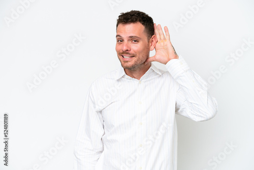 Young caucasian handsome man isolated on white background listening to something by putting hand on the ear