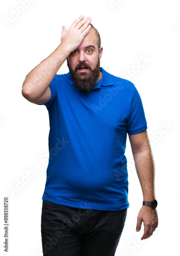 Young caucasian hipster man wearing blue shirt over isolated background surprised with hand on head for mistake, remember error. Forgot, bad memory concept.