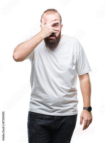 Young caucasian hipster man wearing casual t-shirt over isolated background peeking in shock covering face and eyes with hand, looking through fingers with embarrassed expression.