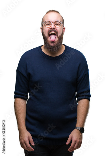Young caucasian hipster man wearing sunglasses over isolated background sticking tongue out happy with funny expression. Emotion concept.
