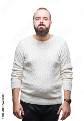 Young caucasian hipster man wearing winter sweater over isolated background puffing cheeks with funny face. Mouth inflated with air, crazy expression.