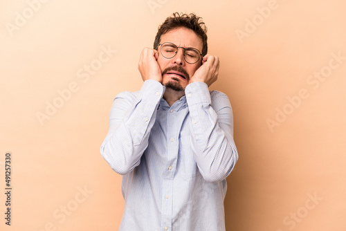 Young caucasian man isolated on beige background crying, unhappy with something, agony and confusion concept.