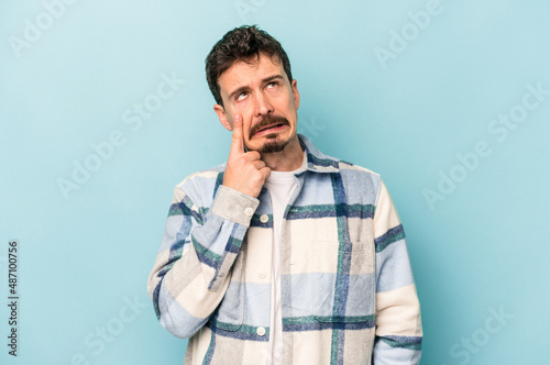 Young caucasian man isolated on blue background crying, unhappy with something, agony and confusion concept.