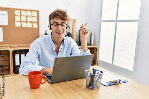 Young caucasian man wearing call center agent headset at the office smiling happy pointing with hand and finger to the side