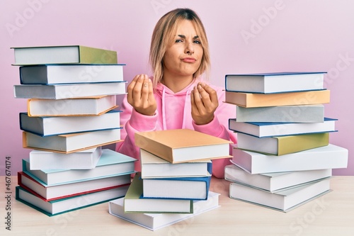 Young caucasian woman sitting on the table with books doing money gesture with hands, asking for salary payment, millionaire business