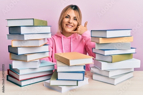 Young caucasian woman sitting on the table with books smiling doing phone gesture with hand and fingers like talking on the telephone. communicating concepts.