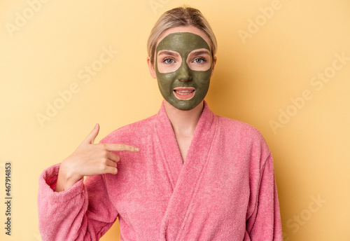 Young caucasian woman wearing face mask isolated on yellow background person pointing by hand to a shirt copy space, proud and confident