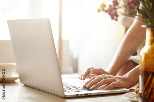 Young Caucasian woman with beautiful neat manicure using laptop sitting at desk next to window, drinking coffee while checking email on her computer before going to work. Selective focus, flare sun