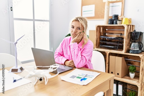 Young caucasian woman working at the office thinking looking tired and bored with depression problems with crossed arms.