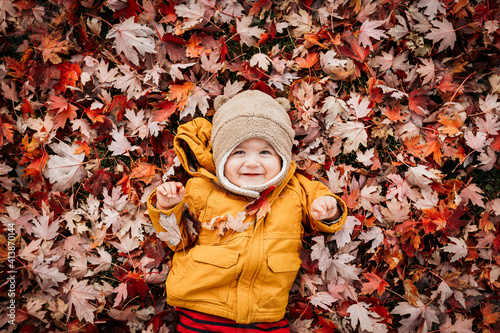 Young child playing in a pile of leaves in the fall