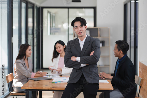 Young confident Asian businessman standing in the office room with their coworkers in the background.