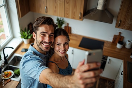 Young Couple Capturing a Selfie While Cooking Together in Their Warm Kitchen