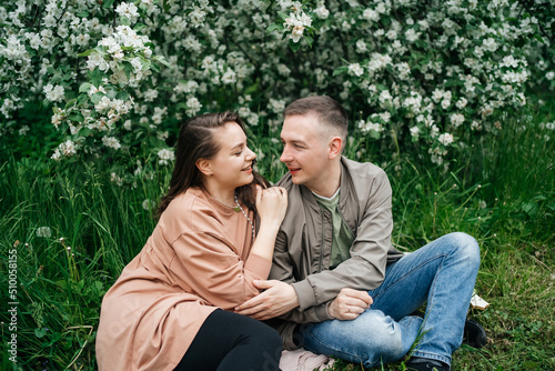 young couple in love a girl and a man sit on the grass of a flowering apple tree the aroma of flowers outdoors