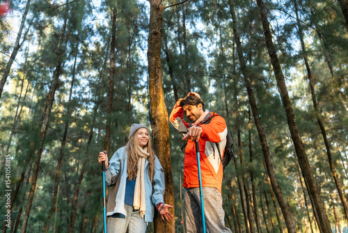Young Couple Resting Against Tree During a Winter Hike. Enjoying the Golden Hour Light in a Peaceful Forest, Wearing Warm Clothes and Backpacks, Sharing a Quiet and Happy Moment Together