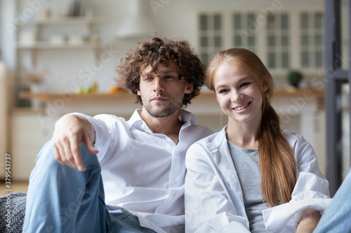 Young couple sitting on sofa looking at camera. Enjoy together.