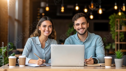 Young couple, smiling and working together on a laptop in a cafe, embodying modern business and teamwork