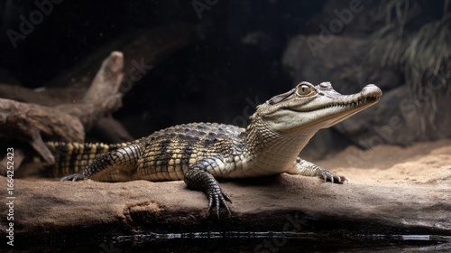 Young Crocodile Resting on Log Near Water in Natural Habitat