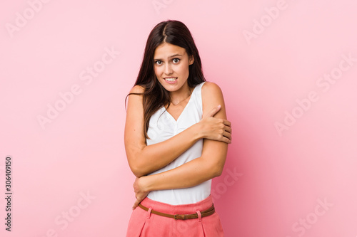 Young cute woman going cold due to low temperature or a sickness.