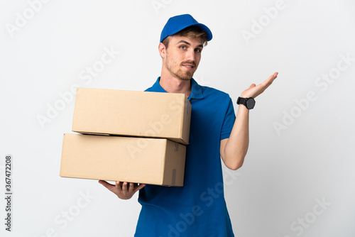 Young delivery blonde man isolated on white background extending hands to the side for inviting to come